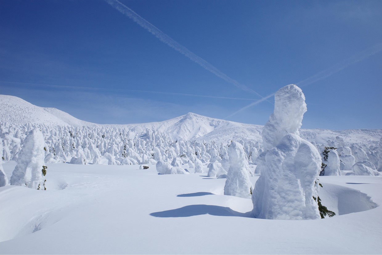 蔵王温泉からロープウェイで樹氷原にアクセスし、地蔵岳樹氷原や中央高原の森をスノーシューやカンジキで歩いた満喫するスノーハイクです。